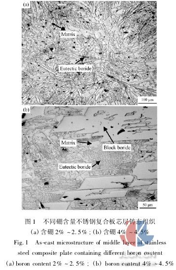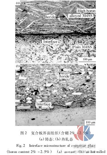 采用10kg真空熔煉爐在0.1kpa的真空條件下熔煉并澆鑄出3種不同硼含量的高硼不銹鋼芯料,將芯料置于澆鑄模內(nèi),從鑄模的上澆口中澆入作為覆層的普通不銹鋼,使之包覆在芯料周圍,制備出尺寸為120mm×100 mm×80mm,硼含量分別為2.0%~2. 5%、3.0%~3.5%、4.0%~4.5%的復(fù)合材料坯料。包覆澆鑄后的坯料在1150℃下經(jīng)過鍛造及350型可逆熱軋機(jī)上的熱軋變形,軋制成最終厚度為3mm左右的不銹鋼復(fù)合板。軋制變形時,最初2道次的壓下量為20%~30%,使鑄態(tài)組織充分破碎,隨后壓下量降低至15%左右,每4~5個道次回爐重新加熱。