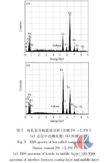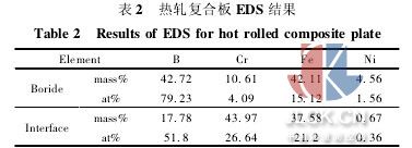 對熱軋后芯層中的硼化物及復(fù)合板界面處進(jìn)行了eds分析,結(jié)果如圖3及表2所示。芯層中硼化物的b含量達(dá)到42.72%,原子分?jǐn)?shù)達(dá)到79.23%,根據(jù)fe-b二元相圖[8],判斷該物相的成分中含有fe2b相。芯層中的硼化物除含有較多的fe 外,還含有一定量的cr、ni。cr元素由于是易形成碳化物的元素,而且具備生成cr-b化合物的熱力學(xué)條件,因此推斷該相中cr的存在形式有兩種: cr的碳化物和cr2b,綜上可知芯層塊狀硼化物的主要成分為: cr的碳化物,fe2b和cr2b。界面處硼含量較低,但cr含量較高,說明界面處的組織仍主要是α-fe基體相,但界面附近存在有少量由芯層越過界面擴(kuò)散到覆層而形成的二次硼化物。