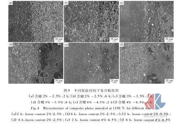 圖4為1150℃下,2、4、6h退火,高硼不銹鋼/普通不銹鋼復(fù)合板界面組織。從圖4中可看到,高溫下,由于界面兩側(cè)的整體硼含量差別較大,硼原子有將跨過界面向覆層擴(kuò)散的趨勢。此時,擴(kuò)散的主要驅(qū)動力應(yīng)該是界面兩側(cè)奧氏體基體中硼原子濃度差引起的自由能梯度。但是,復(fù)合板是經(jīng)過熱軋變形的,含硼不銹鋼芯層中的一部分硼原子已經(jīng)擴(kuò)散到了界面的另一側(cè),因此,此時擴(kuò)散的主要驅(qū)動力則是覆層普通不銹鋼基體在界面附近和遠(yuǎn)離界面的區(qū)域硼原子的濃度差提供的。硼原子在基體中的溶解度非常低,而且覆層不銹鋼中的硼化物含量也極低,這就導(dǎo)致了硼原子在覆層中的擴(kuò)散速率隨之降低[9]。