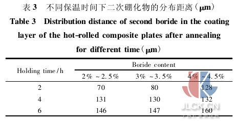 結(jié)合圖4、表3可以看出,隨著芯層硼含量的升高,同樣保溫時間下二次硼化物的分布距離增加,但這種變化的程度并不大。這是由于,一方面,隨著硼含量的增加,芯層中細(xì)小的共晶硼化物以及二次硼化物的數(shù)量是明顯增加的。這些硼化物可能隨著硼原子的擴(kuò)散,部分溶解到基體中,因此有利于擴(kuò)散的進(jìn)行。另一方面,過共晶硼化物在保溫過程中基本不會出現(xiàn)局部向基體中溶解的過程。在硼原子從界面向覆層的擴(kuò)散過程中,基本上不受到中間層組織中的過共晶硼化物的影響。所以,硼原子的擴(kuò)散速率隨著中間層硼含量的增加而變化的程度不大。