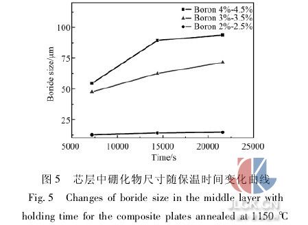 復(fù)合澆鑄過程中芯層與覆層界面處的間隙通過大變形量的熱軋變形完全可以實(shí)現(xiàn)冶金結(jié)合。擴(kuò)散處理過程中硼原子在界面附近的擴(kuò)散速率很低并且隨著中間層硼含量的增加變化的程度不大。隨著保溫時間的延長,硼原子的擴(kuò)散距離也在增加,但其擴(kuò)散速率是逐漸降低的。雖然硼化物在保溫過程中的粗化行為近似滿足